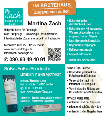 Vor 1 Monat – Die Leistungen auf einem Blick: • Innovative laserbasierte Nagelpilzbehandlung ohne Nebenwirkungen • Behandlung des diabetischen Fußes • Behandlung von Hühneraugen, Warzen, pilzbefallenen und eingewachsenen Nägeln • Nagelkorrekturspangen, Nagelprothetik, Orthesen • Reflexzonenmassage Gern füh[...]