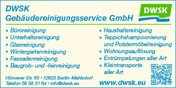 Die DWSK Gebäudereinigungsservice GmbH steht für Qualitätsreinigungen aller Art zu fairen Preisen und das schon seit über 20 Jahren. Das Leistungsangebot erstreckt sich von der modernen Gebäudereinigung, von der Glas- und Rahmenreinigung, sowie der Büro-, Industrie- und Baureinigung, über die Reinigung von Mehrfamilienhäusern, Schulen und Behörden bis hin zur Labor- und Krankenhausreinigung sowie zur Wartung gebäudetechnischer Ausrüstungen. Der Firmensitz in der Hönower Strasse 63, in Berlin-Mahlsdorf, bietet Ihnen die Möglichkeit, hochwertige Produkte zu wirklich fairen Preisen zu erstehen. Dabei wird nicht nur Auskunft über die Anwendung und Funktionsweise der Produkte gegeben, sondern auch eine umfassende Beratung in allen Belangen gewährleistet. DWSK - einfach mehr als Reinlichkeit.